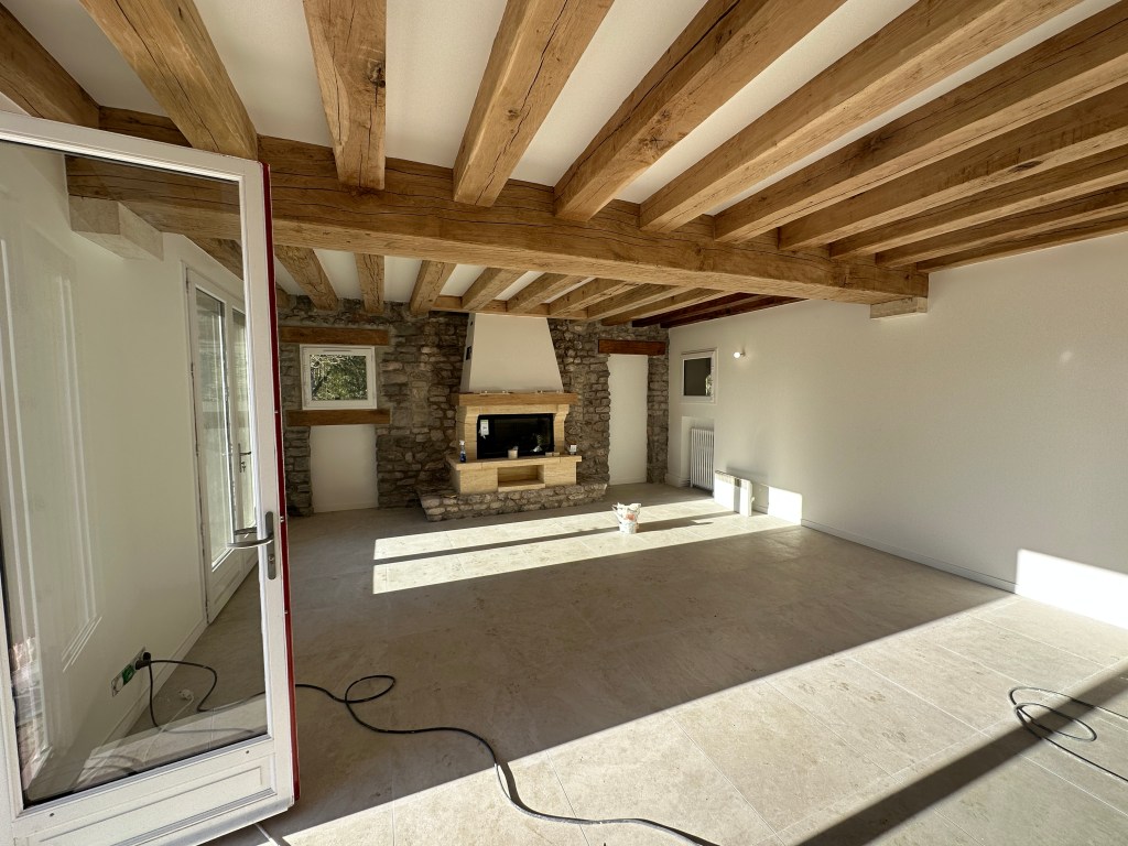 Rénovation totale de la maison dans le respect des matériaux nobles. Dans le salon : remplacement du plancher et des poutres en chêne, remplacement de la cheminée, des fenêtres, du sol en pierres